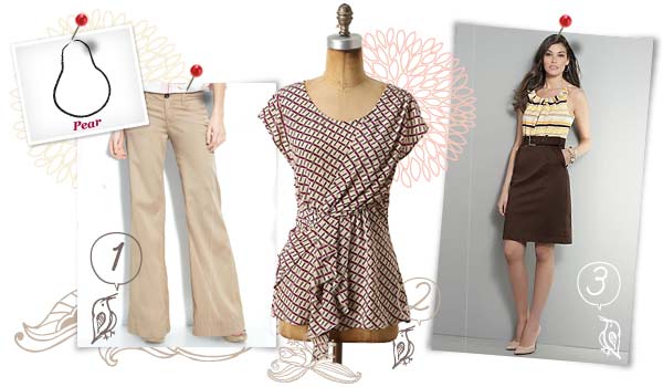 - Style challenges include finding clothing items that fit both your waist (tiny) and your hips (a bit wider). Dresses can be a challenge because slim-cut fashion may not flare enough to accommodate the bottom half of your pear shaped body, while remaining tailored to the top half of your body.