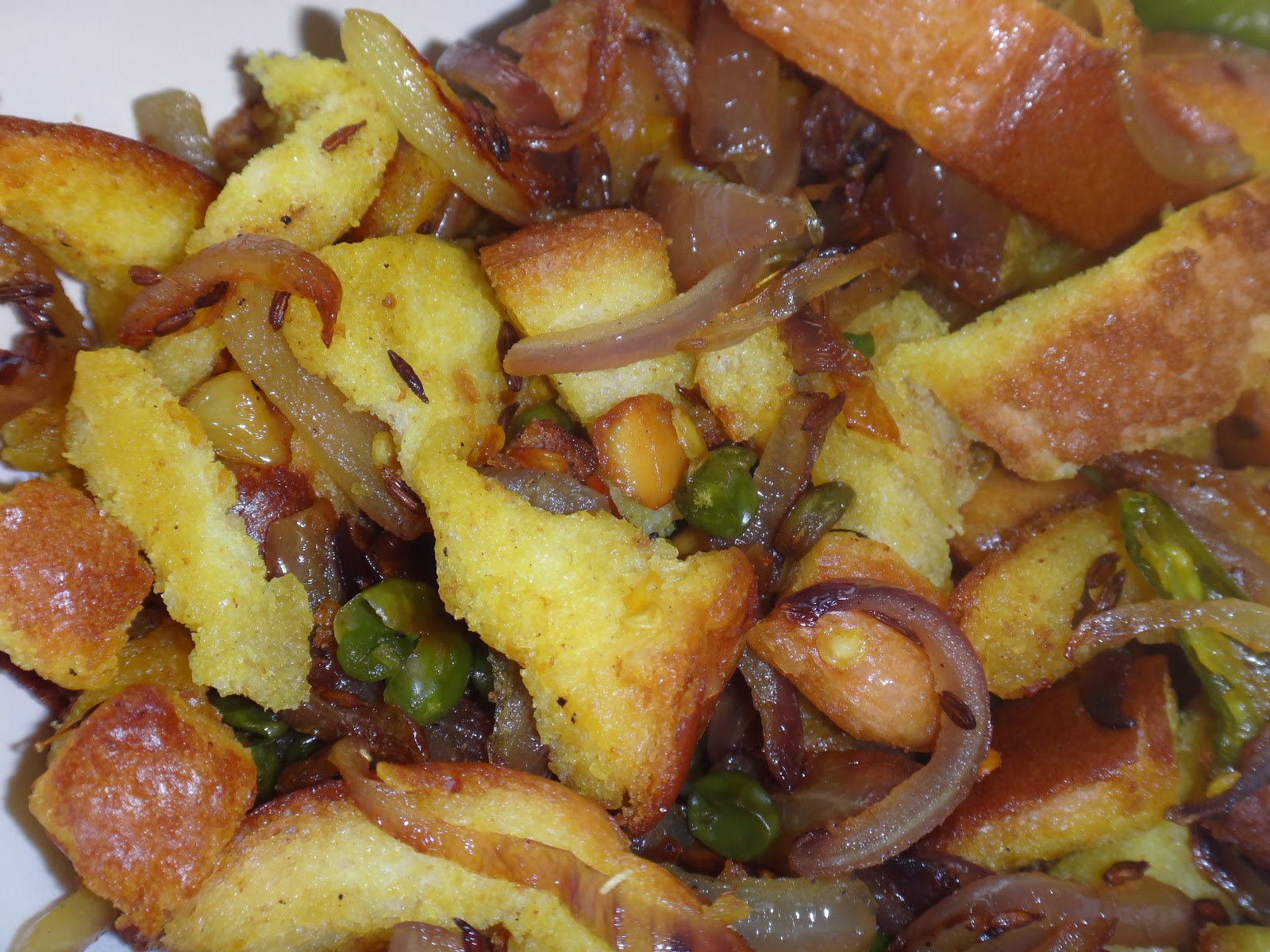 Step 7: Add turmeric powder and red chili flakes and let it cook for a minute and finally add bread pieces and stir carefully without breaking any pieces