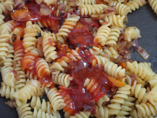 Step 6:After frying the mixture for a minute add pasta and salsa , toss well and carefully so that pasta wont break up. Finally add the remaining olive oil or just sprinkle oil on the pasta .