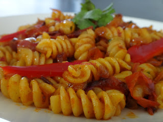Original pasta recipe is a blend of all Italian herbs with loads of cheese in it , as I am not a favorite to cheese , I tried a spicy recipe mixing both Italian herbs and Mexican style which came out very well with the perfect taste .