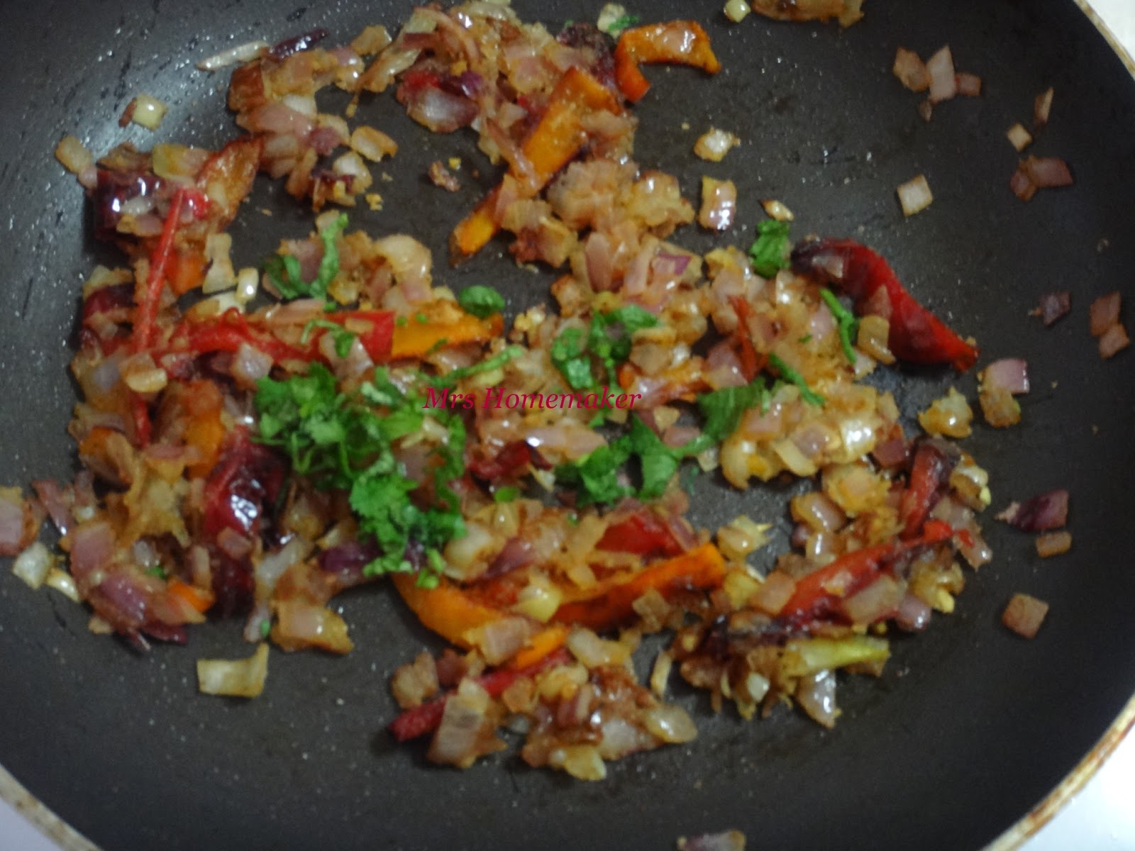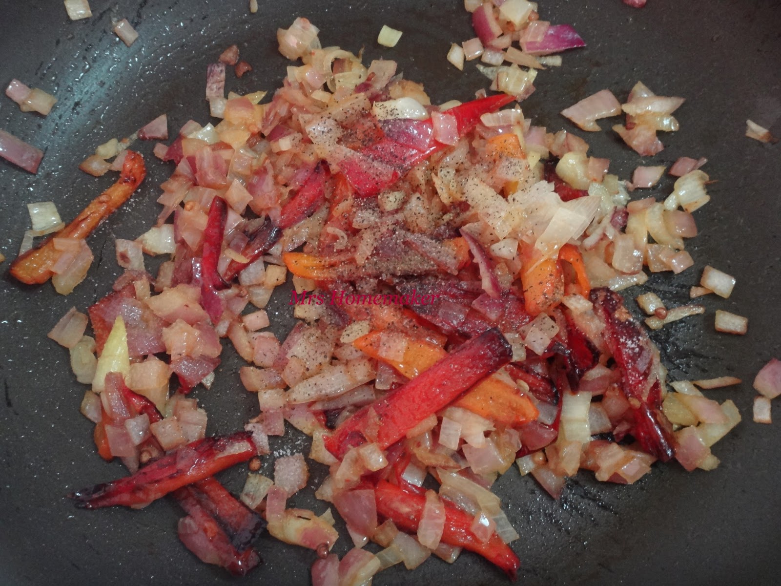 Step 3: Slice the bell peppers into long thin pieces , add a table spoon of olive oil to a frying pan and when ready add garlic , when they turn light brown add bell peppers ,chopped onions and fry them for five minutes .