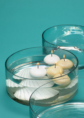 Adding some pebbles or shells or pearls gives a beach theme.You can also colour the pebbles to match the candles.